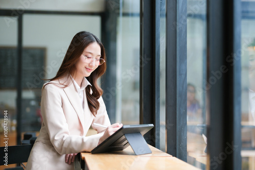 Professional businesswoman using a tablet and digital pen for analysis, design, and planning.