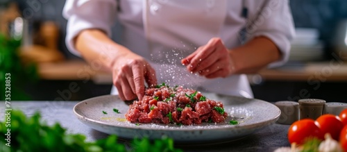 Professional chef preparing and seasoning a succulent piece of meat on a elegant serving plate