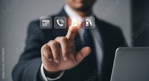 Professional clicks glowing digital business icons on a futuristic virtual interface, accessing schedule, communication, and data.