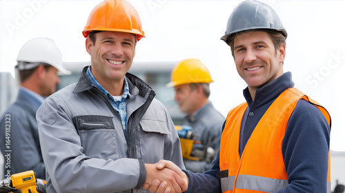 Professional construction workers shake hands, showcasing teamwork and collaboration project site. Their smiles reflect positive working