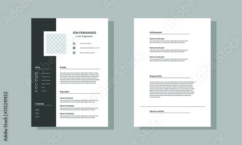 Professional CV resume template design and A4 size two page vector minimalist - black and white.