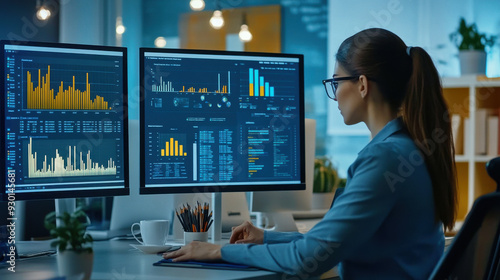 Professional Data Analyst analyzing Data Analytics KPI trends, surrounded by a modern office setup with interactive displays