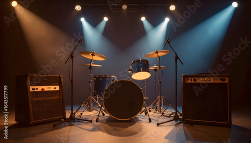 Professional drum set and musical equipment illuminated by theatrical stage lights on a dark background, awaiting a band's performance or live concert.