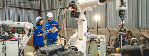 Professional engineer team are checking and control automation robot arms machine in intelligent industrial factory, Monitoring software system of robotics welding and digital manufacturing operation.