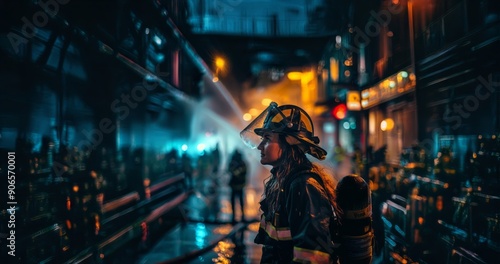Professional Female Firefighter Battling a Large Urban Blaze with a Hose.Generated image