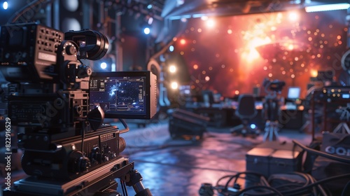 Professional film studio set with a camera and vibrant cosmic background, ideal for sci-fi movie or media production themes.