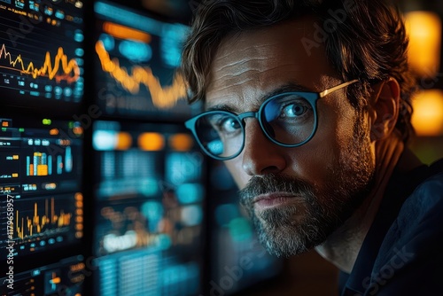 professional financial analyst working with multiple screens displaying real-time market data and investment analytics in contemporary office setting
