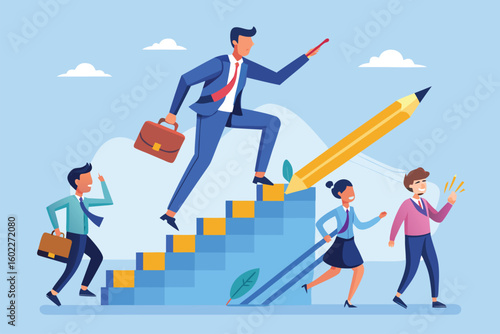 Professional growth illustrated through individuals climbing stairs while engaging in various activities in a vibrant workplace setting