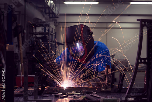 Professional Heavy Industry Welder Working Inside factory, Wears Helmet and Starts Welding. Selective Focus