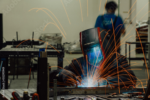 Professional Heavy Industry Welder Working Inside factory, Wears Helmet and Starts Welding. Selective Focus