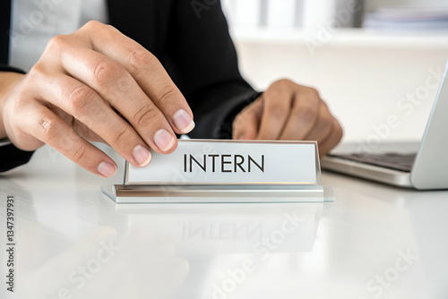 Professional Intern Desk Nameplate with Close-Up of a Hand Placing the Intern Sign in Modern Office Environment