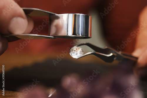 Professional jeweler evaluating beautiful gemstone, closeup view