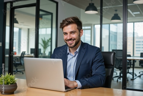 Professional Man in Office Setting Working on Laptop Smiling Confidently in Modern Workspace