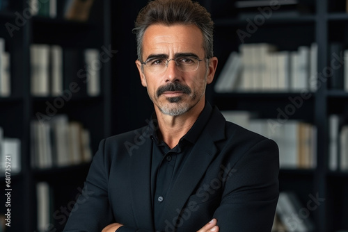 Professional man wearing suit standing confidently in front of bookshelf. This image can be used to represent intelligence, success, professionalism, or concept of knowledge