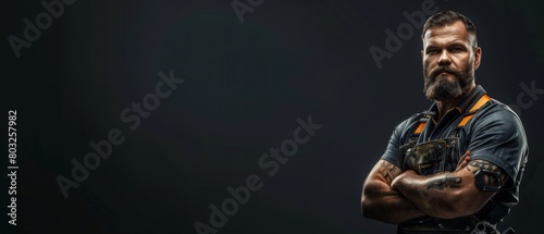 Professional Mechanic in Workwear Displaying Tools, Closeup of Skilled Labor with Serious Expression on Dark Background