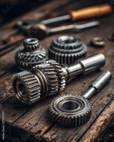 Professional mechanical auto transmission gears and parts on rustic workbench authentic craftsmanship for premium auto repair marketing content