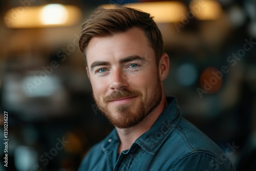 Professional photo of a modern car repair professional in a monochrome uniform, posing with arms crossed, with soft and natural lighting enhancing the portrait