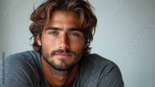 Professional portrait of a man with long hair and thoughtful expression in studio setting