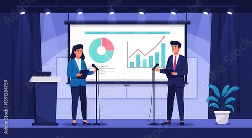 Professional Presentation A business meeting with a speaker presenting data and financial analysis with visual graphs on a screen.