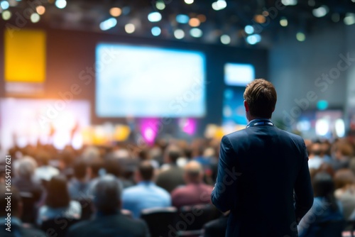 Professional speaker presenting on a stage with a large projection screen, symbolizing leadership, communication, and knowledge sharing.