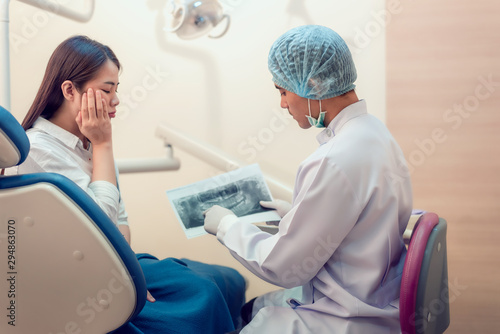 Professional stomatologist showing teeth model and talking with sadly young female
