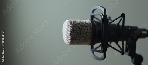 Professional studio microphone with shock mount on neutral background for recording and broadcasting