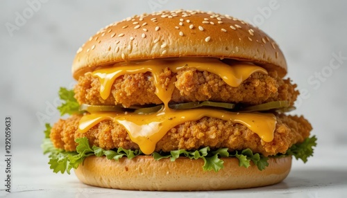 Professional studio photography of a fried chicken burger, with melted cheese and mayo sauce and orange sauce, 4k, ultra realistic, realistic style, with NO sesame seeds on the bun, soft bun
