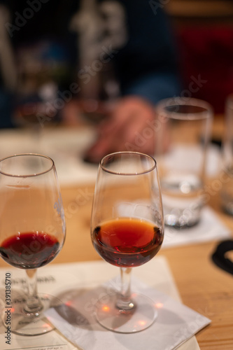 Professional tasting of different fortified dessert ruby, tawny port wines in glasses in porto cellars in Vila Nova de Gaia, Portugal