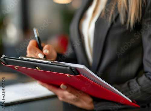 Professional woman in business attire holding a red clipboard and writing notes with a pen in a modern office environment.
