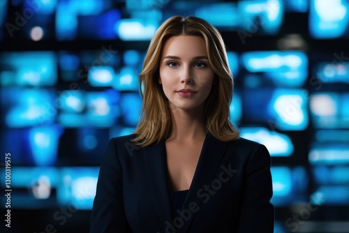 Professional woman in formal attire standing confidently in front of screens displaying news