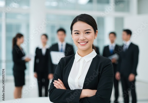 Professional woman smiling with arms crossed in front of her team in an office setting indoor