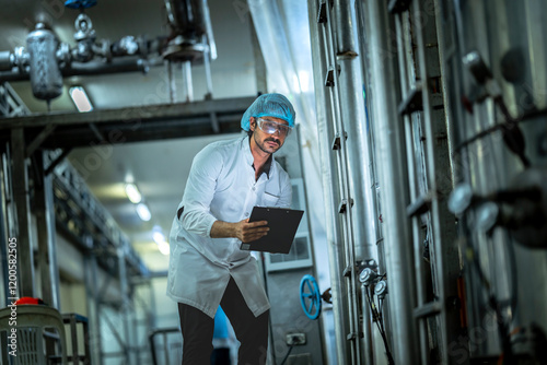 Professional worker analyzing operational data on production equipment in a state-of-the-art food factory Prioritizing efficiency and safety compliance.