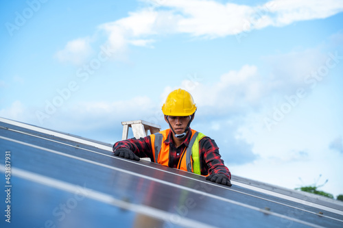 Professional worker working and installing solar panels at solar power plant,Innovative solution for energy solving,Use renewable resources,Green energy.