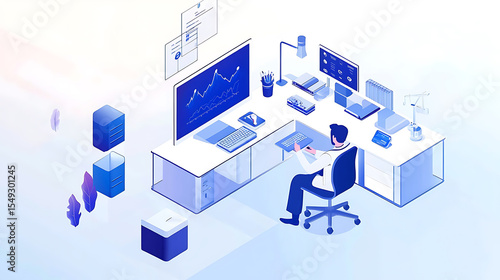 Professional working at a modern office desk with multiple monitors and data analytics tools
