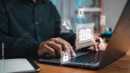 Professional working on digital learning with laptop and elegant icons for modern training solutions