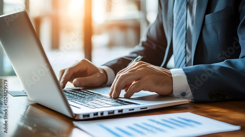 Professional working on laptop with data charts, dressed in suit in office environment with sunlight.