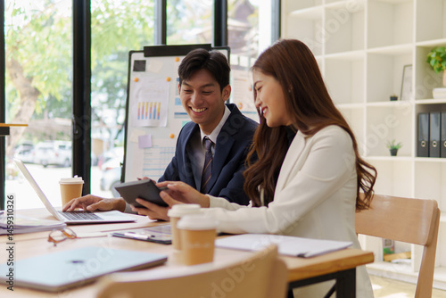 Professionals businesspeople reviewing documents and discussing plans at a meeting.