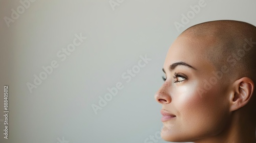 Profile of a confident, bald woman gazing forward with a serene expression against a soft background.