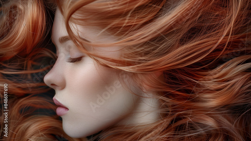 Profile of a woman with red hair, highlighting her flowing locks and delicate features.