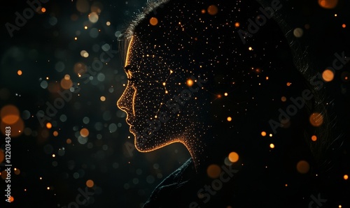 Profile of Female Silhouette Composed of Glowing Data Points and Neural Network Connections in Dark Abstract Technological Background, Representing AI and Big Data Visualization, Generative AI