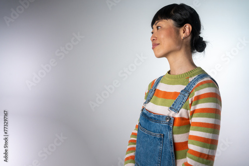 Profile side view portrait of attractive cheerful woman demonstrating copy space ad new isolated over grey color background. Beautiful natural woman looking at copy space, spa and wellness concept.