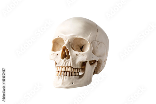 Profile view human skull displaying cranial sutures and complete tooth arrangement in mandible, isolated on a transparent background