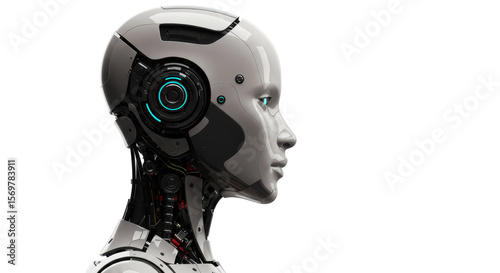 Profile view of a futuristic, detailed robot head and neck, showcasing intricate mechanical design elements.