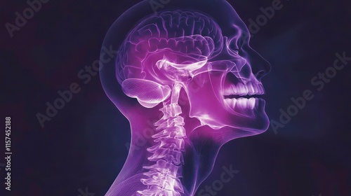 Profile view of a translucent human head and neck, highlighting the brain and spinal column in shades of purple.