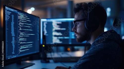 Programmer working on responsive website design, comparing mobile and desktop versions, focused on user experience and interface adjustments