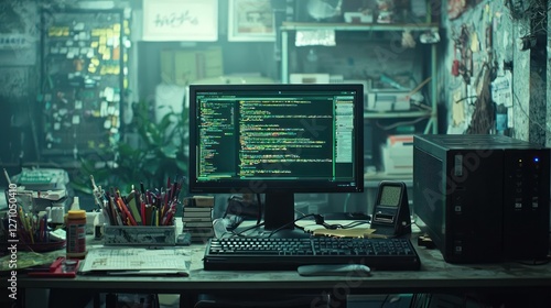 Programmer's Dark Workspace: Green Coding Screen on Cluttered Desk