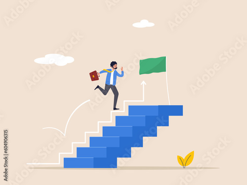 Progress concept. Improvement to success, step forward to grow business, journey to achieve goal, ambition or career path, businessman walk up growth chart and graph with stair to success.