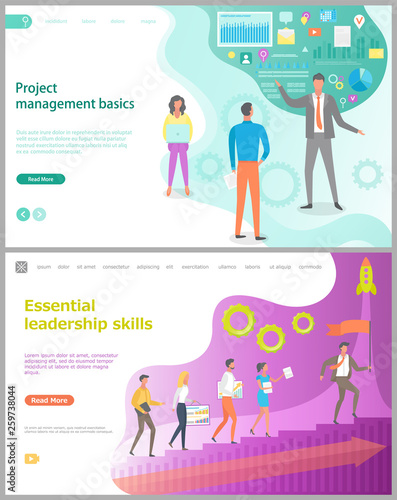 Project management basics, essential leadership skills, teamwork researching process, growing of company, presentation analysis, rising step. Website page template, landing web flat style vector
