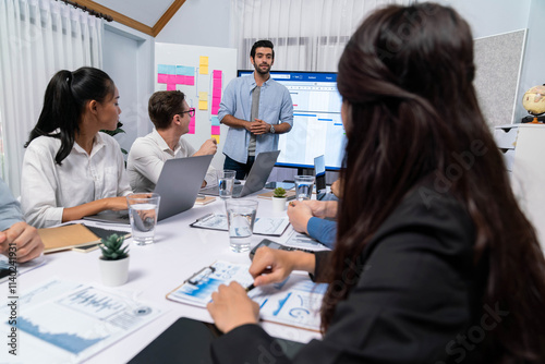 Project manager communicate and collaborate with team using project management software display on monitor, tracking progress of project task and making schedule plan at meeting table. Prudent