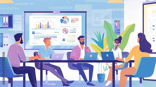 Project Manager Leading a Meeting: In a conference room, a project manager leads a team meeting, discussing project goals and assigning tasks to ensure everything runs smoothly